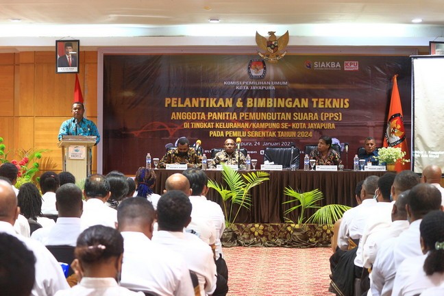 Jayapura, kota-jayapura.kpu.go.id - KPU Kota Jayapura melantik dan mengambil sumpah janji 117 calon anggota Panitia Pemungutan Suara (PPS) se-Kota Jayapura untuk Pemilihan Umum Tahun 2024, Selasa (24/01/2023). Kegiatan ini diagendakan akan berlanjut dengan Bimbingan Teknis (Bimtek) oleh KPU Kota Jayapura.